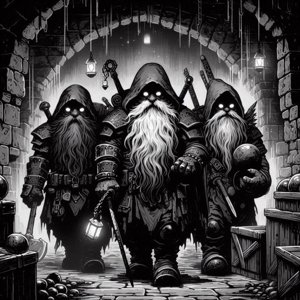 Duergars (also known as grey dwarves) are short, scrawny, bearded demihumans with grey skin and hair and ugly visages. They are around 4’ tall, weigh about 120 pounds, and have lifespans of up to 500 years. Duergars dwell in strongholds and cities deep underground. They are renowned for their greed for precious metals and stones and for their xenophobia toward other races. Duergars have a naturally strong constitution and are highly resistant to magic.