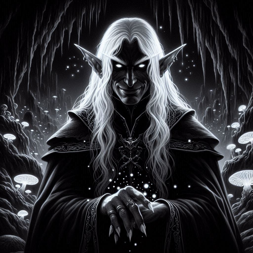 Drow (also known as dark elves) are slender, fey demihumans with pointed ears, skin as black as the night sky, and hair of silver or white. They have extremely long lifespans, being nigh immortal. Drow dwell exclusively underground, carving great cities of stone and crystal. They are related to the elves of the surface world and share their love of nature and magic.